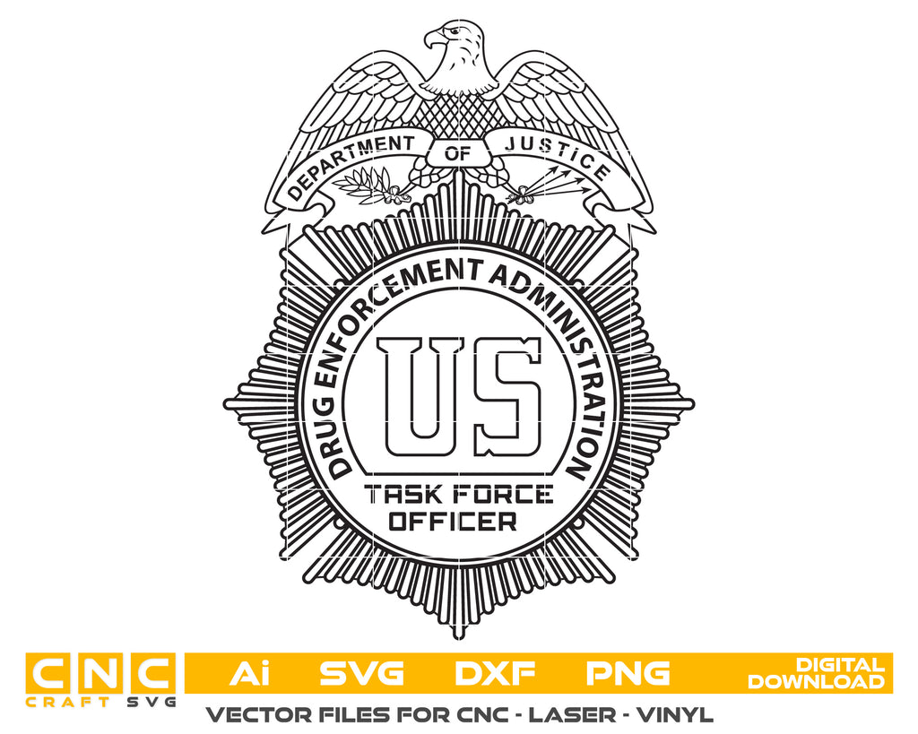 Download a professionally redrawn Drug Enforcement Task Force Officer Badge Vector Art SVG featuring precise linework, clean vector paths, and fully scalable detailing. This premium-quality badge design is ideal for laser engraving, CNC cutting, Cricut, Silhouette, vinyl decals, tactical gear printing, plaques, signage, and collectible artwork.