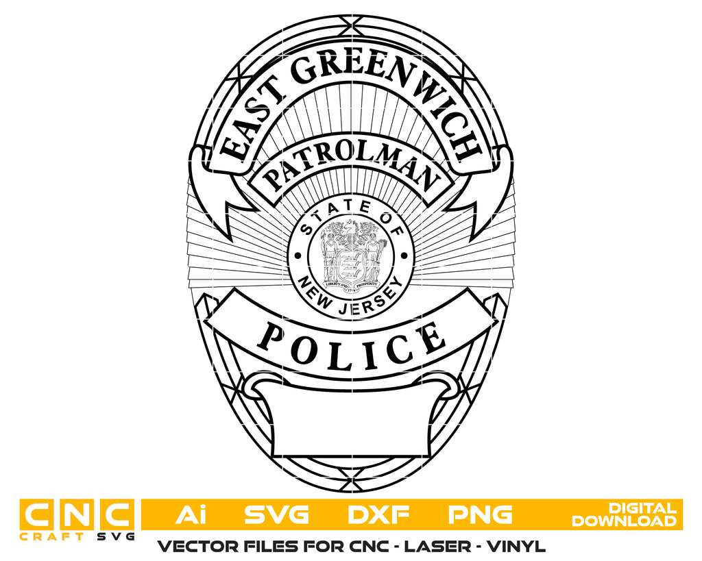 Create professional-quality law enforcement designs with this East Greenwich Patrolman Police Badge SVG, a clean and detailed vector badge inspired by the East Greenwich Police Department in New Jersey. Designed for accuracy and clarity, this badge artwork is ideal for high-quality cutting, engraving, and printing applications.