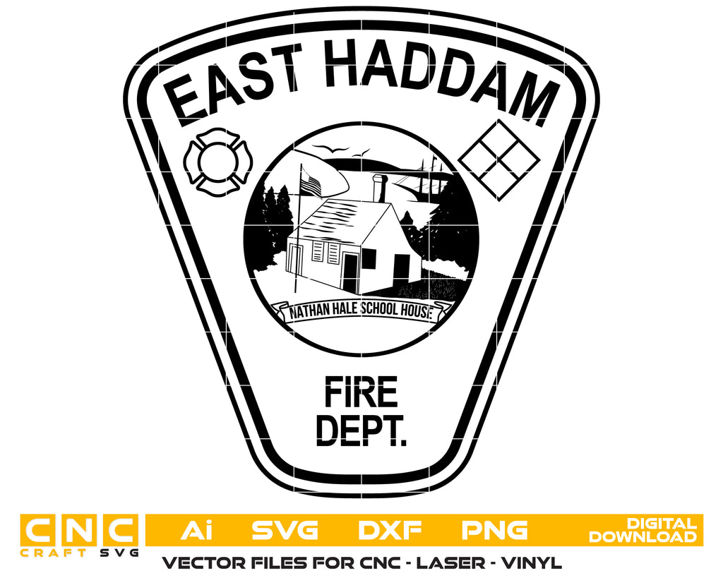 Honor the bravery, leadership, and service of Connecticut firefighters with this East Haddam Fire Department Badge SVG — a crisp, high-quality vector design perfect for crafting, printing, engraving, and commemorative projects.