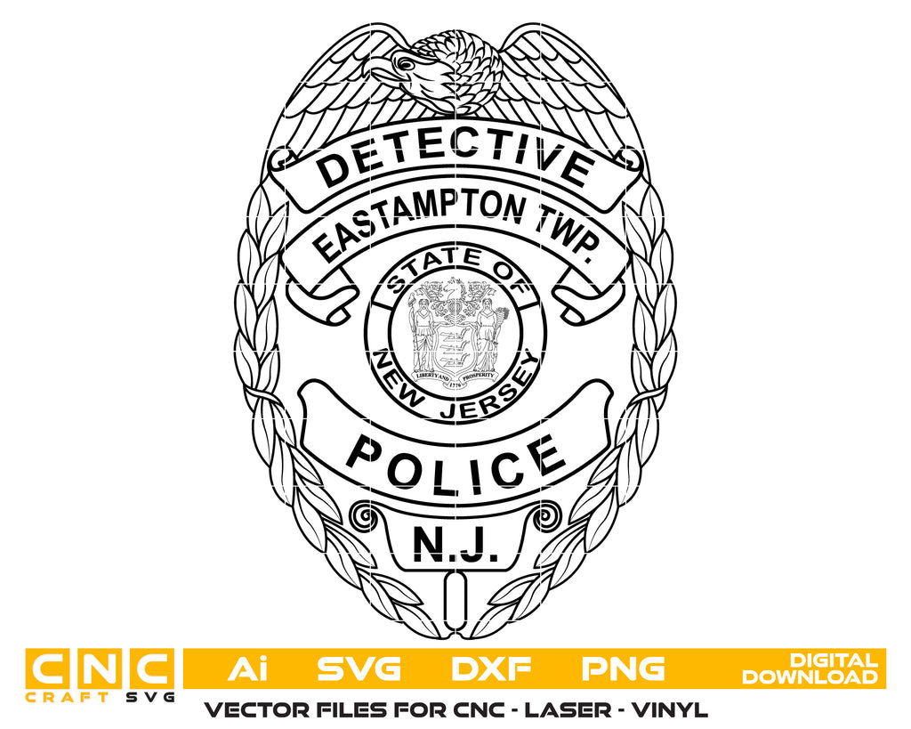 Create professional-quality law enforcement designs with this Eastampton Township Detective Police Badge SVG, a clean and detailed vector badge inspired by the Eastampton Township Police Department in New Jersey. Designed for accuracy and clarity, this badge artwork is ideal for high-quality cutting, engraving, and printing applications.