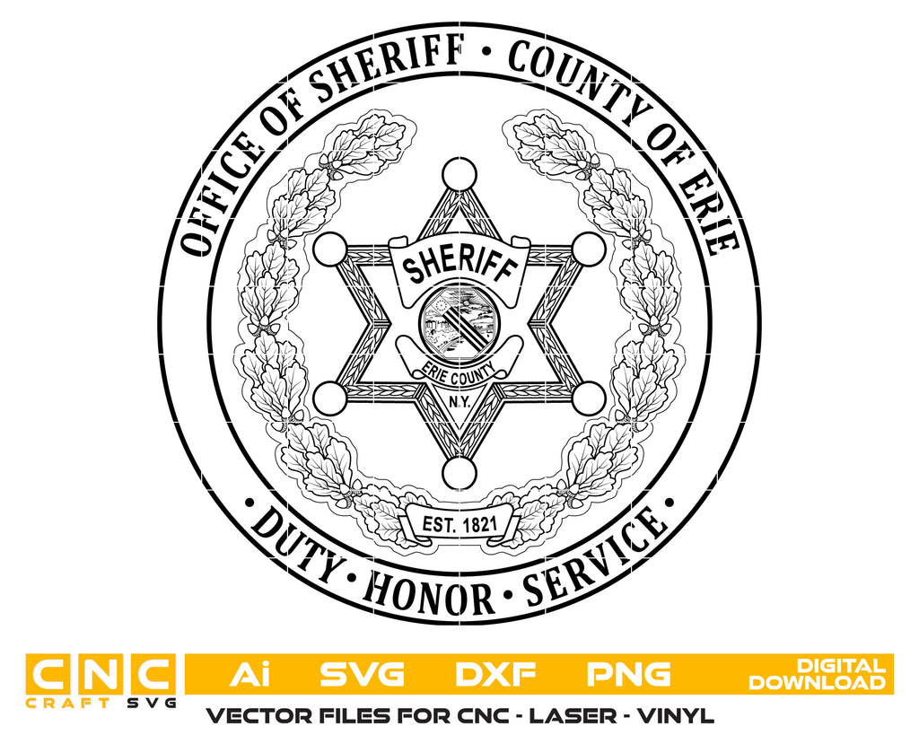 Add professional detail and official presence to your law enforcement projects with the Erie County Sheriff’s Office Logo SVG. This layered vector design is ideal for laser engraving, CNC cutting, vinyl decals, plaques, uniforms, and signage. Designed to retain sharp clarity and precise detailing at any size, it works seamlessly on metal, wood, acrylic, leather, and fabric. Perfect for department branding, commemorative displays, and collectible logos representing Erie County Sheriff’s Office.