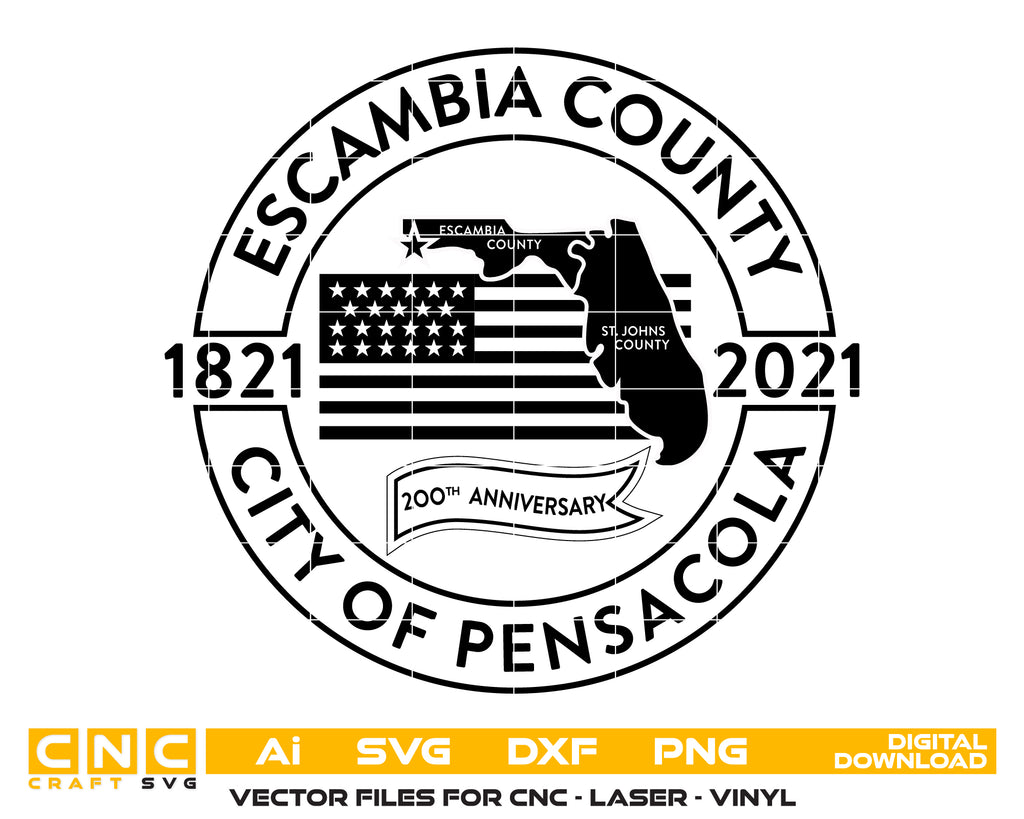 Perfect for engraving, printing, and cutting, this digital design is compatible with Cricut, Silhouette, Glowforge, and other machines. Use it on signs, t-shirts, tumblers, plaques, or any custom project that honors Escambia County's bicentennial.