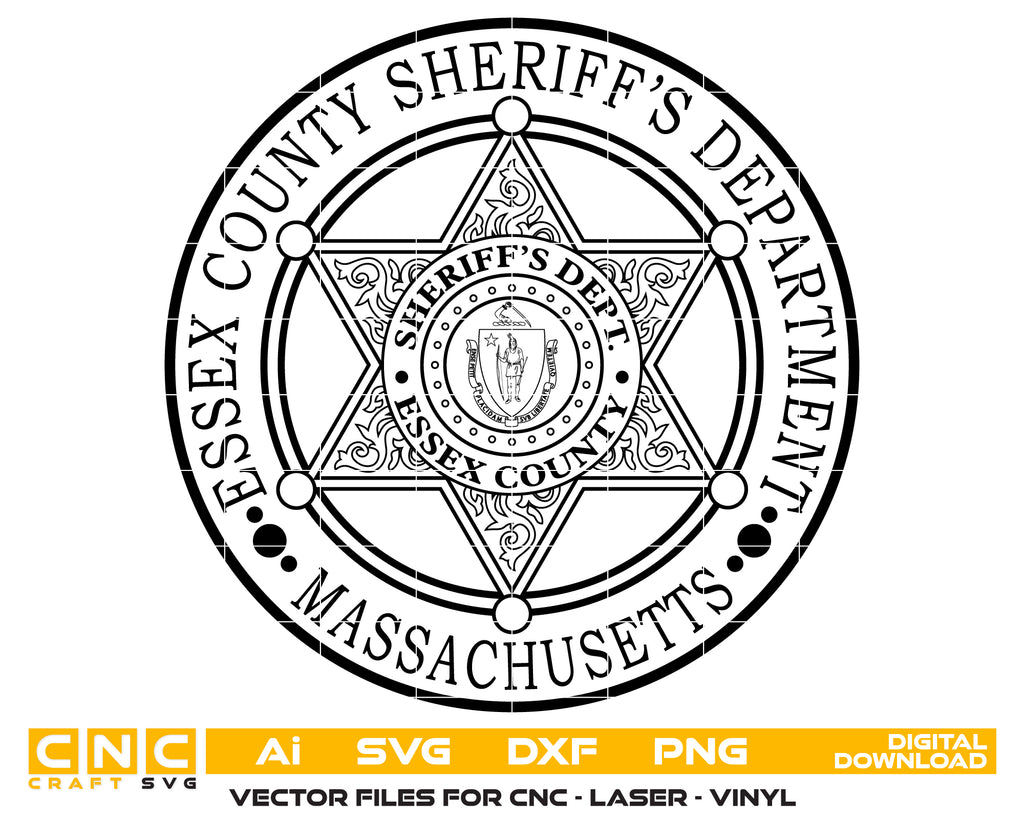 The Essex County Sheriff’s Department Badge SVG is a detailed Massachusetts law enforcement emblem recreated in professional vector format. Designed for versatility, it’s perfect for CNC cutting, laser engraving, vinyl decals, uniform decoration, commemorative plaques, and official signage. With sharp, scalable vector lines, it guarantees crisp results on wood, metal, fabric, and acrylic. Ideal for sheriff memorabilia, county plaques, collector displays, and custom woodworking projects, this file ensures accuracy and authenticity for engravers, crafters, and collectors.