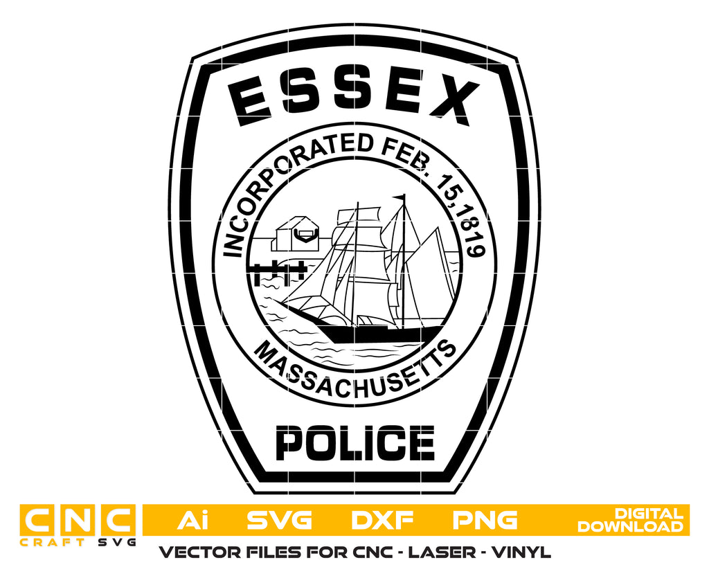 The Essex Police Patch SVG is a high-quality Massachusetts law enforcement emblem recreated in professional vector format. This patch is perfect for CNC cutting, laser engraving, vinyl decals, uniform patches, department plaques, and official signage. With sharp, scalable vector lines, it delivers clean results on wood, metal, fabric, and acrylic. An excellent choice for police memorabilia, department recognition, and custom woodworking projects, this design ensures both authenticity and professional precision.