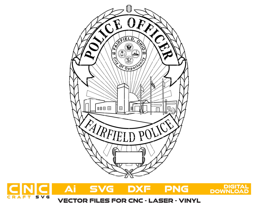 The Fairfield Police Officer Badge SVG is a professional Ohio law enforcement emblem recreated in detailed vector format. This badge is perfect for CNC cutting, laser engraving, vinyl decals, uniform decoration, commemorative plaques, and department signage. With sharp, scalable vector lines, it ensures precise results on wood, metal, fabric, and acrylic. An excellent choice for officer recognition, police memorabilia, and custom woodworking projects, this file delivers both authenticity and professional detail.