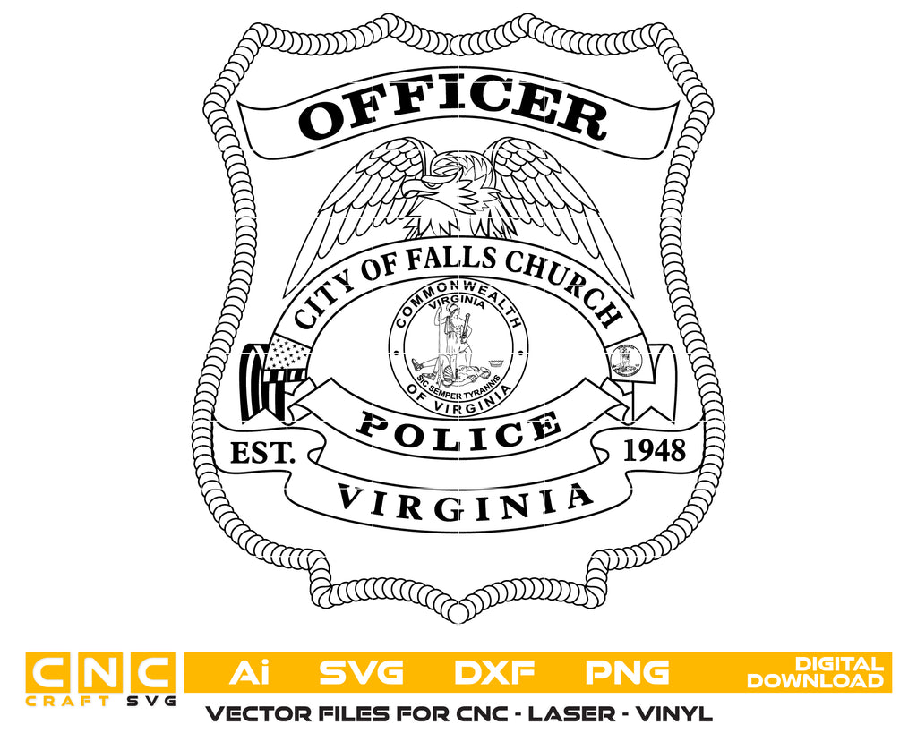 The Falls Church Virginia Police Badge SVG represents the dedication, authority, and service of Virginia law enforcement. Designed in scalable vector format, it’s perfect for CNC cutting, laser engraving, vinyl decals, uniform badges, signage, and commemorative plaques. Ideal for collectors, officers, and custom police memorabilia, this badge maintains crisp detailing on metal, wood, fabric, and acrylic surfaces while honoring the Falls Church Police Department.