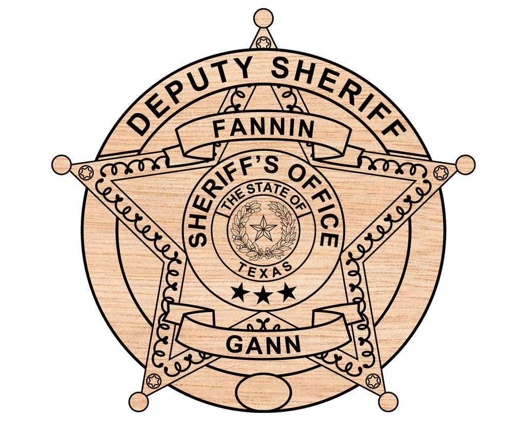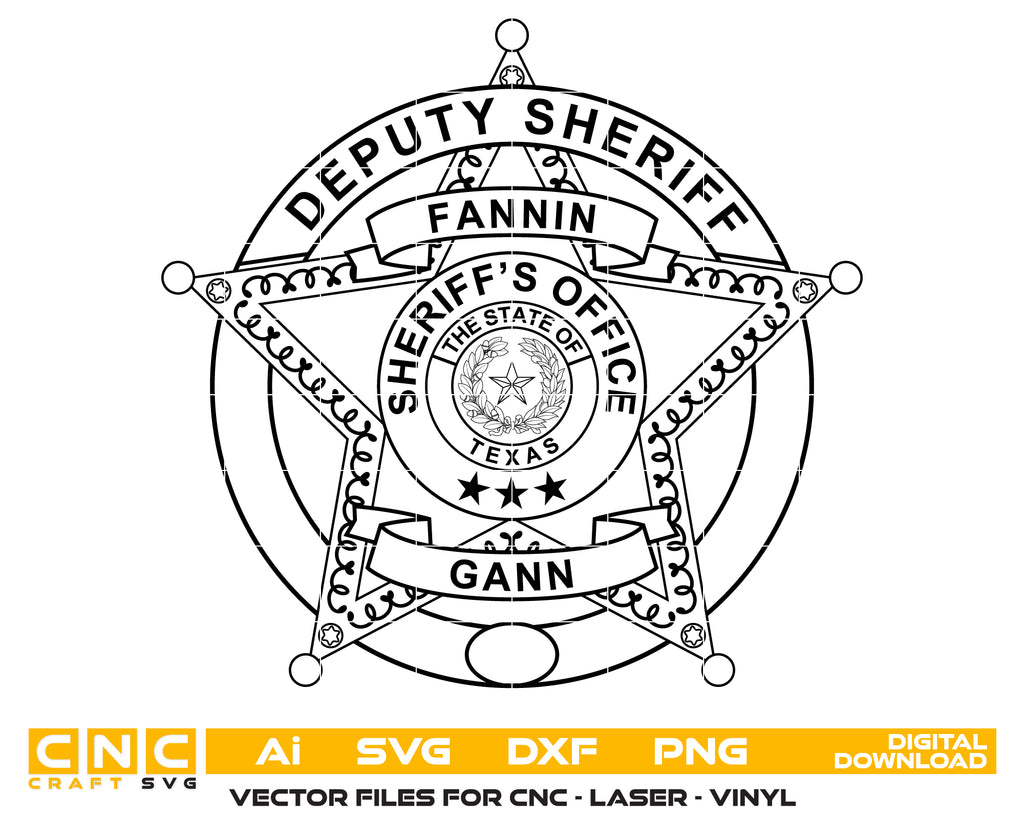 Download a professionally crafted Fannin Texas Deputy Sheriff Badge SVG featuring sharp detailing, clean vector lines, and perfect scalability. This premium vector design is ideal for Cricut, Silhouette, CNC cutting, laser engraving, vinyl decals, signage, apparel, plaques, and both digital and print projects.