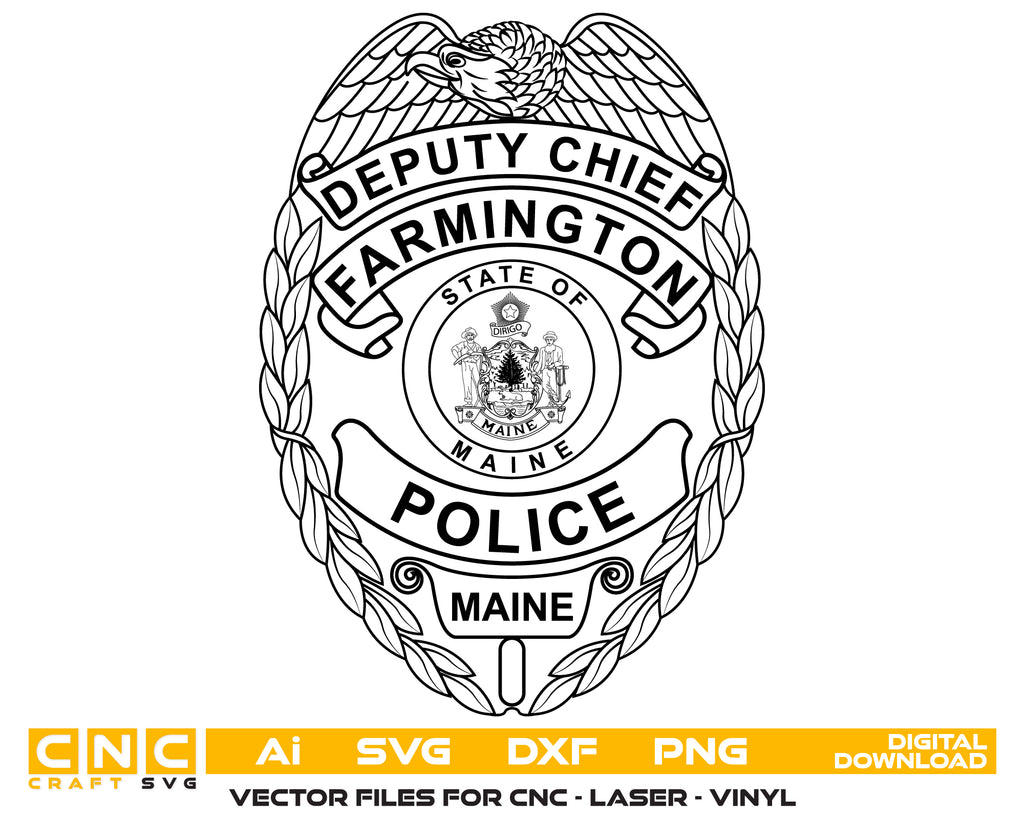 The Farmington Police Deputy Chief Badge SVG is a distinguished Maine law enforcement emblem recreated in high-quality vector format. Designed for precision, this badge is ideal for CNC cutting, laser engraving, vinyl decals, uniform decoration, commemorative plaques, and department signage. With sharp, scalable vector lines, it delivers professional results on wood, metal, fabric, and acrylic. Perfect for deputy chief recognition, law enforcement memorabilia, and custom woodworking projects, this file ensures both authenticity and accuracy for engravers, crafters, and collectors.