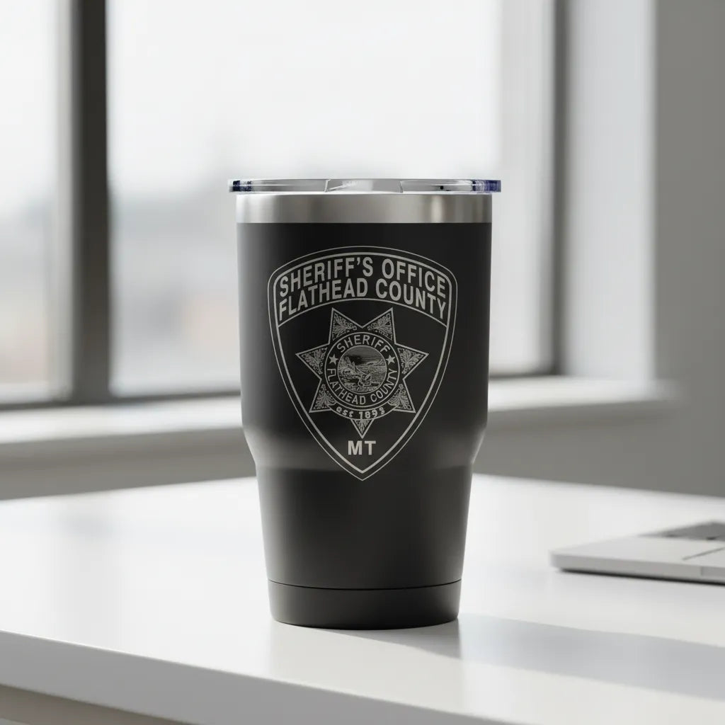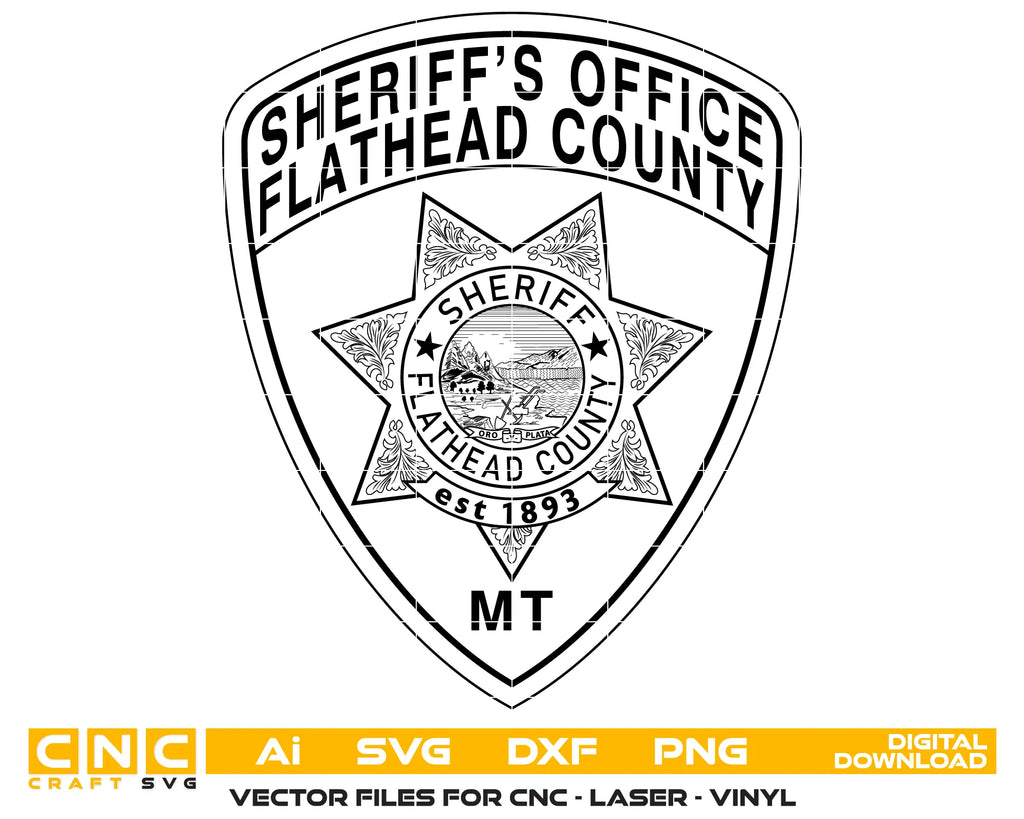 Download the Flathead County Sheriff's Office Patch SVG. This highly detailed Montana law enforcement vector features a classic shield patch outline enclosing an elegant 6-point star accented with intricate filigree. The central emblem beautifully showcases a picturesque mountain and lake scene, complete with crossed mining tools and the state motto "Oro y Plata," commemorating its 1893 establishment. Perfectly optimized for CNC routers, laser engraving, and vinyl cutting, this clean vector file is ideal for creating custom deputy retirement plaques, shadow boxes, and personalized department tribute gifts.