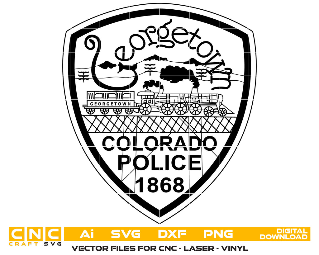 Discover this high-quality Vector SVG file, designed for CNC cutting, laser engraving, and professional crafting. Featuring the official patch design of the Georgetown Colorado Police Department, this file is perfect for tribute pieces, memorabilia, wall art, or detailed signage projects.