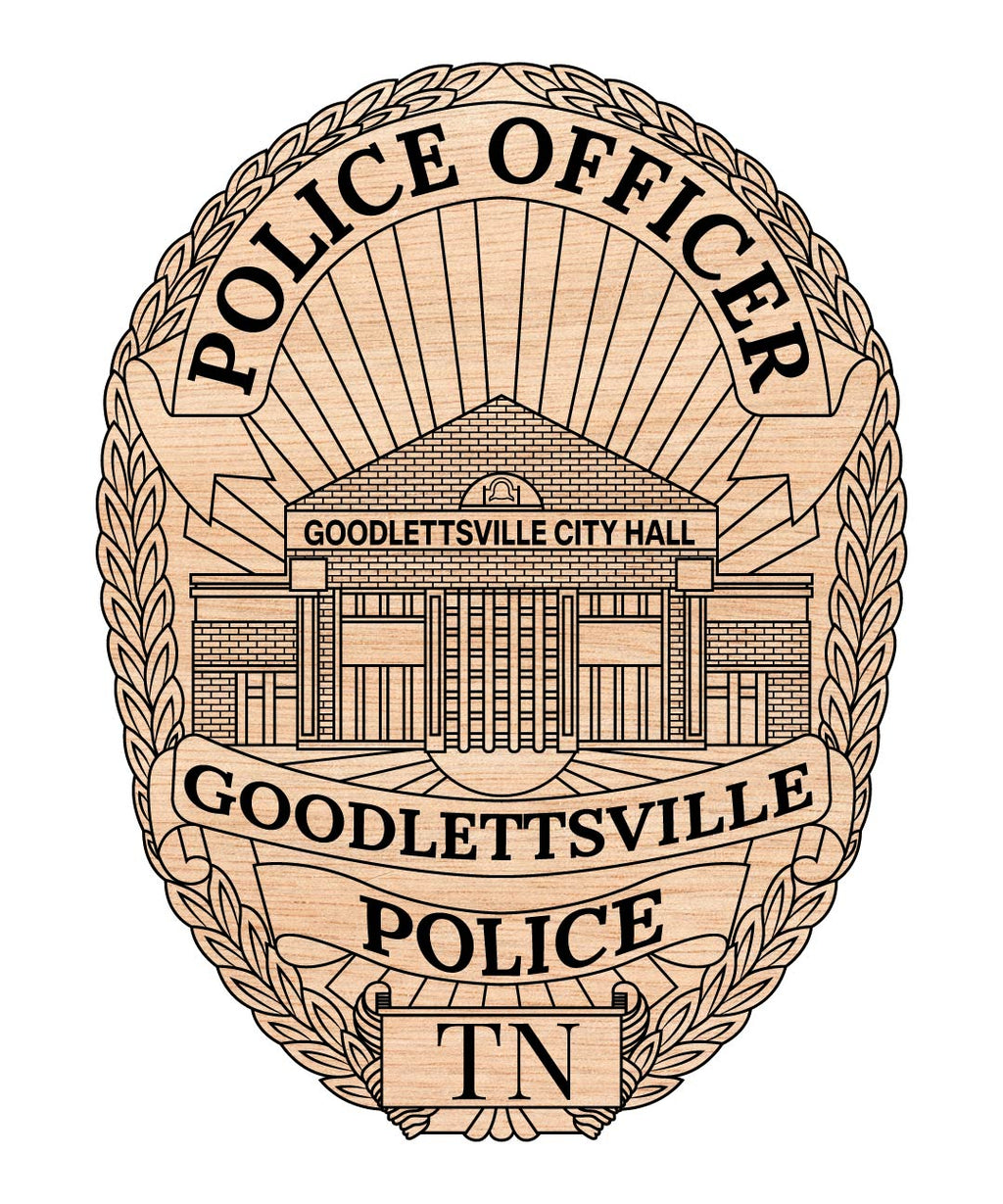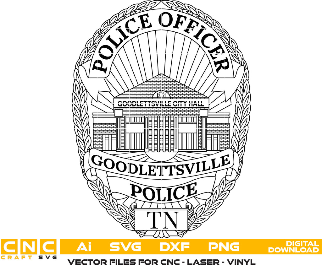 Download a professionally redrawn Goodlettsville City Police Officer Badge Vector Art featuring precision vector detailing, clean engraved-style lines, and fully scalable artwork. This high-quality police officer badge design is ideal for CNC cutting, laser engraving, Cricut, Silhouette, vinyl decals, plaques, signage, apparel printing, and law-enforcement collectible projects.