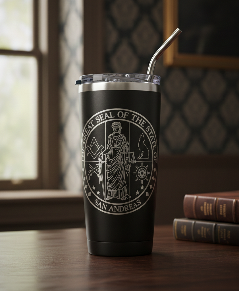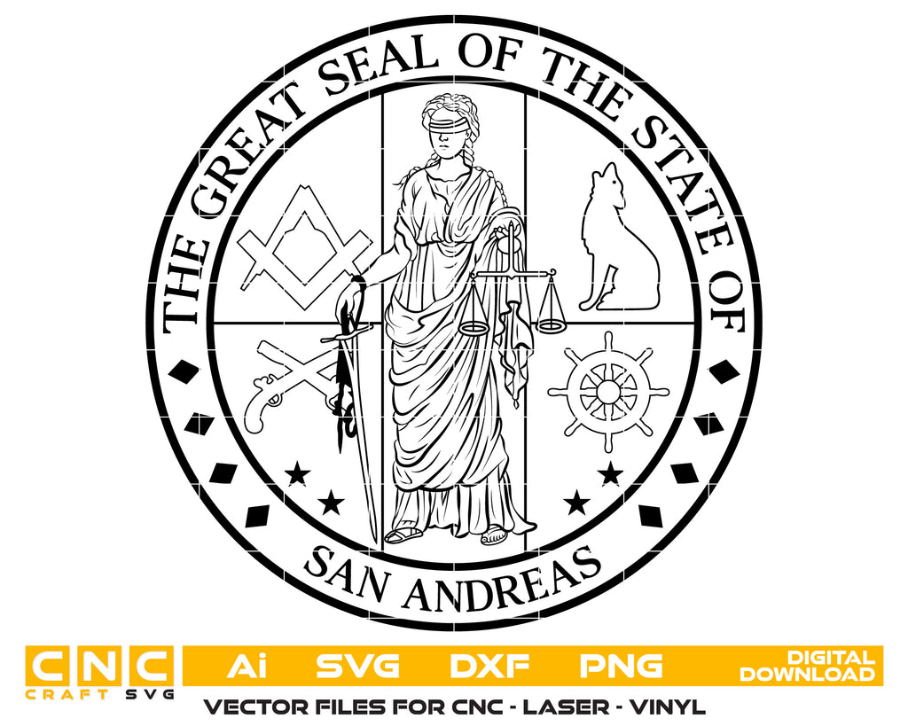 Bring the world of gaming to your workshop with this Great Seal of the State of San Andreas SVG. This detailed vector design features the iconic fictional state emblem, centering on Lady Justice (blindfolded with sword and scales). The shield is surrounded by distinct symbols: the Masonic square and compass, a howling wolf, crossed pistols, and a ship's wheel. Expertly traced for clean lines, this file is perfect for creating cosplay props, roleplay (RP) server merchandise, wooden signs, and custom gamer tributes.