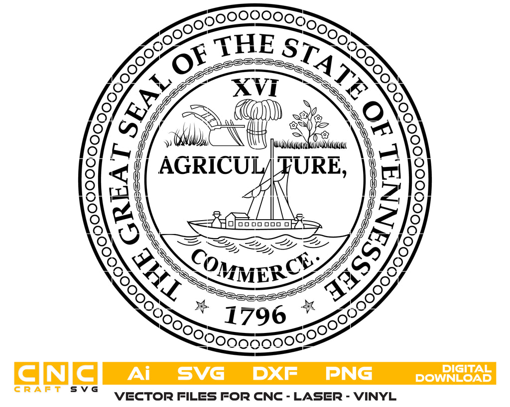 Create professional, high-quality designs with this Great Seal of the State of Tennessee SVG, a detailed vector illustration of the official state seal. Perfect for printing, engraving, apparel, signage, and digital projects celebrating Tennessee’s heritage.