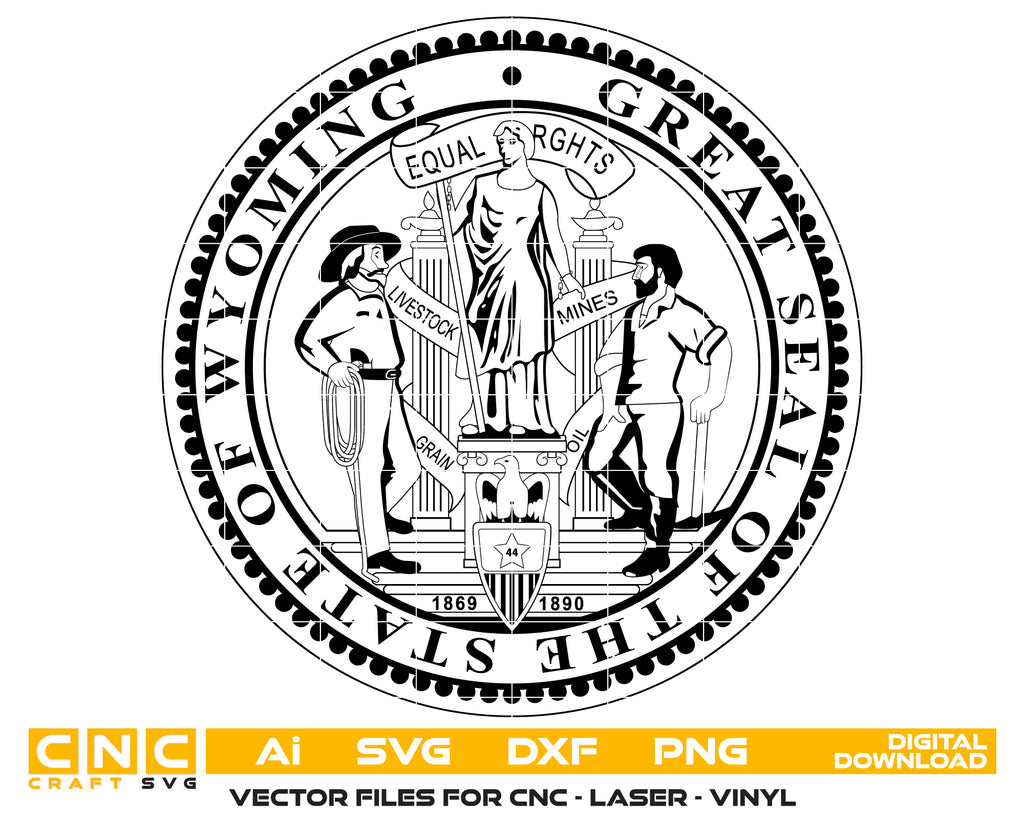 Celebrate Wyoming’s history and official state symbolism with this Great Seal of the State of Wyoming SVG — a crisp, high-quality vector design perfect for crafting, printing, engraving, and display projects.