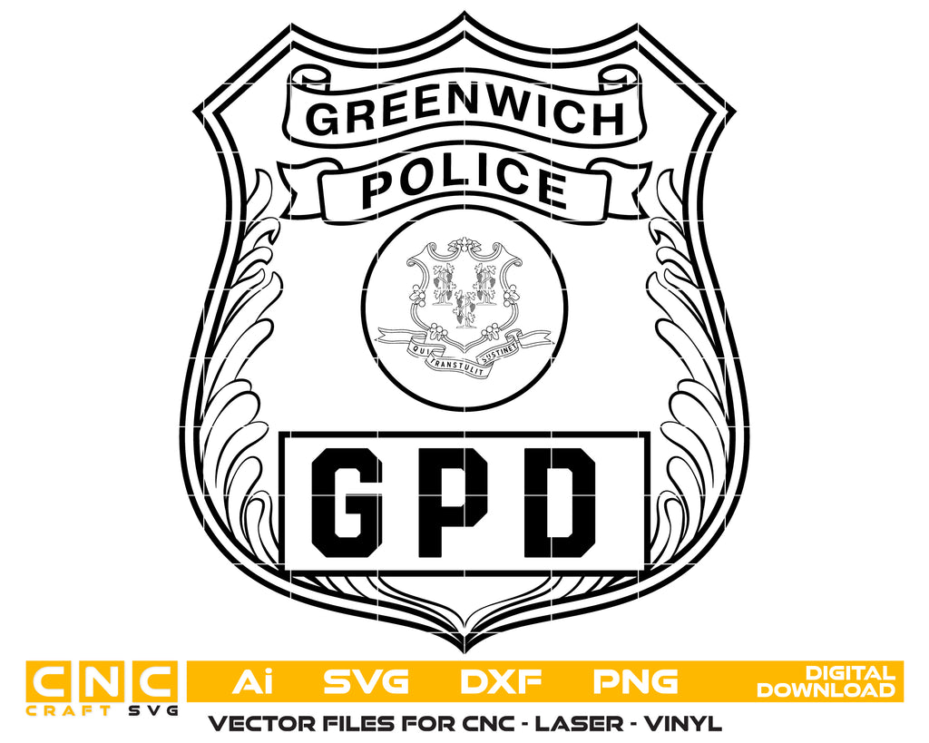 Honor the dedication, service, and professionalism of Connecticut law enforcement with this Greenwich Police Department Badge SVG — a crisp, high-quality vector design perfect for crafting, printing, engraving, and commemorative projects.