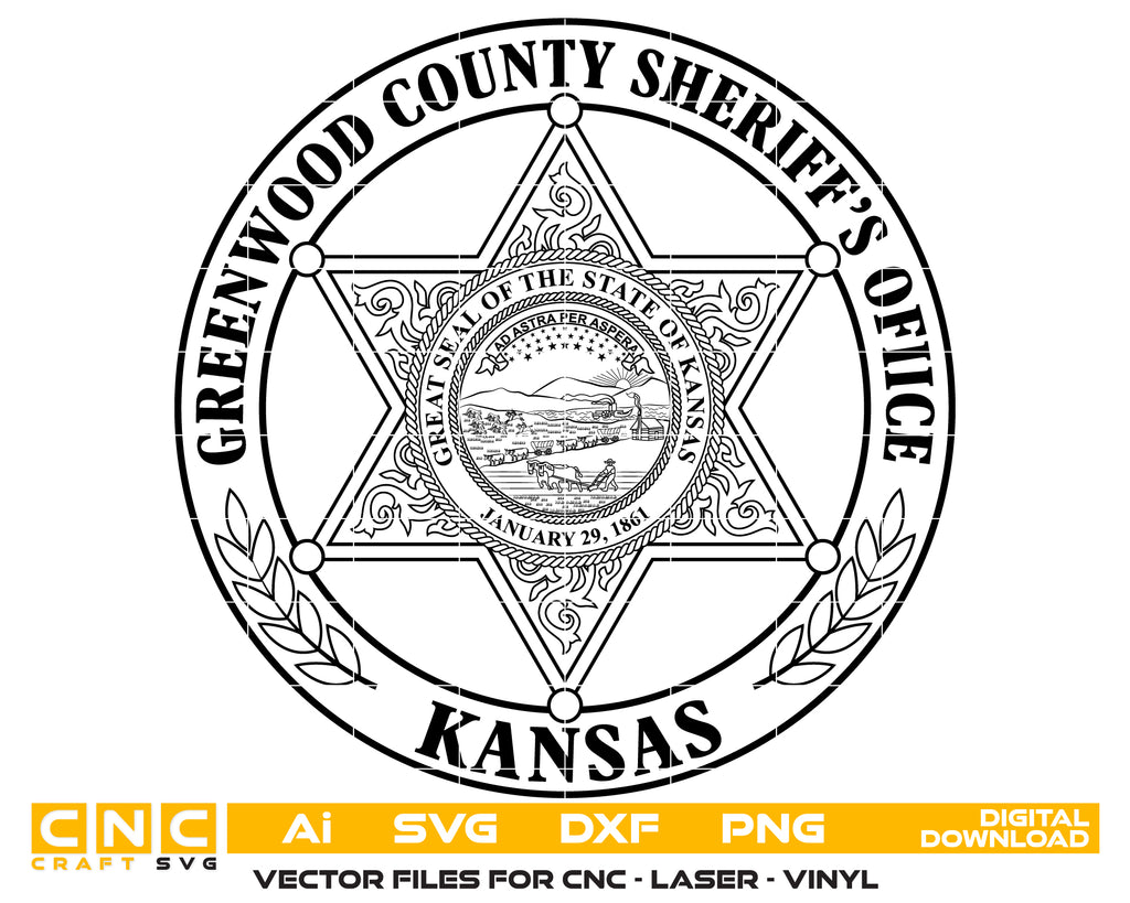 Create professional-quality law enforcement designs with this Greenwood County Sheriff’s Office Badge SVG, a clean and detailed vector badge inspired by the Greenwood County Sheriff’s Office in Kansas. Designed for accuracy and clarity, this badge artwork is ideal for high-quality cutting, engraving, and printing applications.