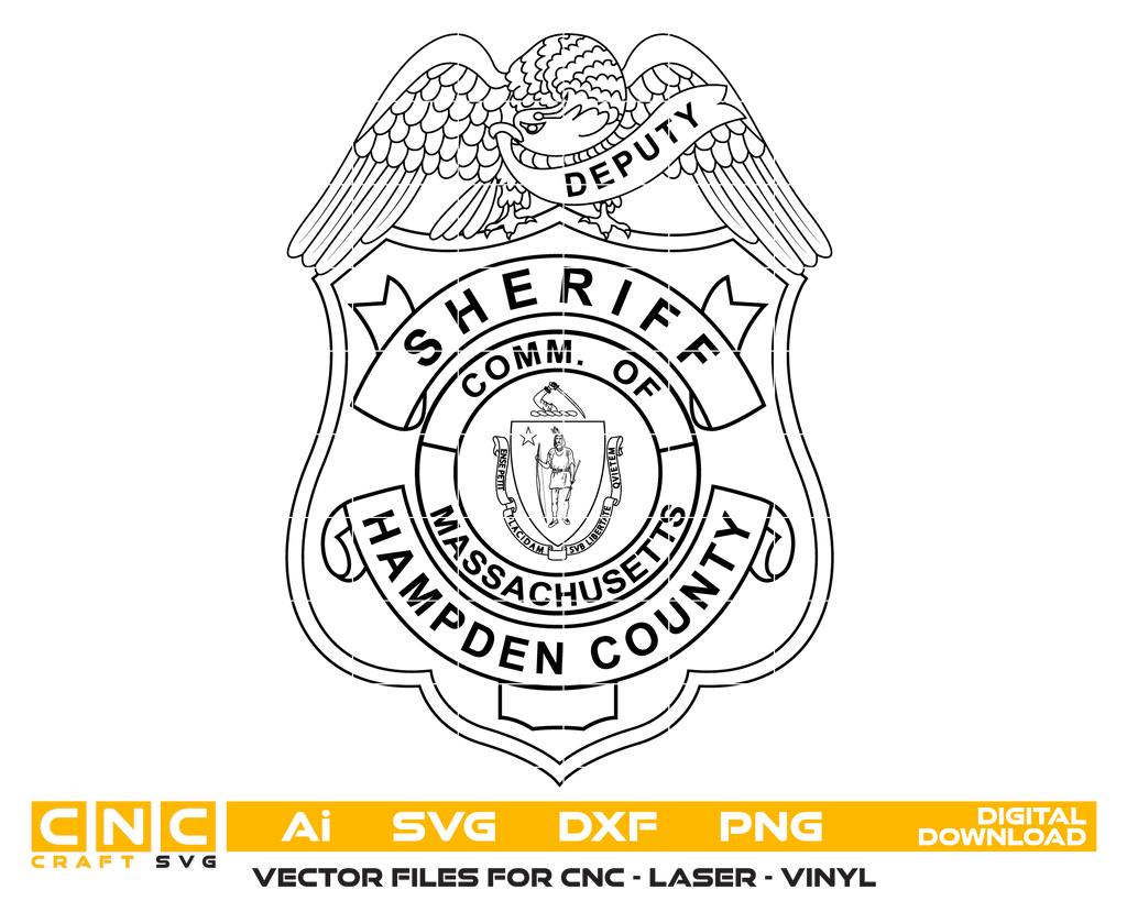 The Hampden County Deputy Sheriff Badge SVG is a professional Massachusetts law enforcement emblem recreated in sharp vector format. Perfect for CNC cutting, laser engraving, vinyl decals, uniform decoration, commemorative plaques, and county signage, this badge ensures crisp, scalable detail. With precise vector lines, it delivers clean results on wood, metal, fabric, and acrylic. A strong choice for sheriff memorabilia, deputy recognition, and custom woodworking projects, this file provides both authenticity and professional accuracy.