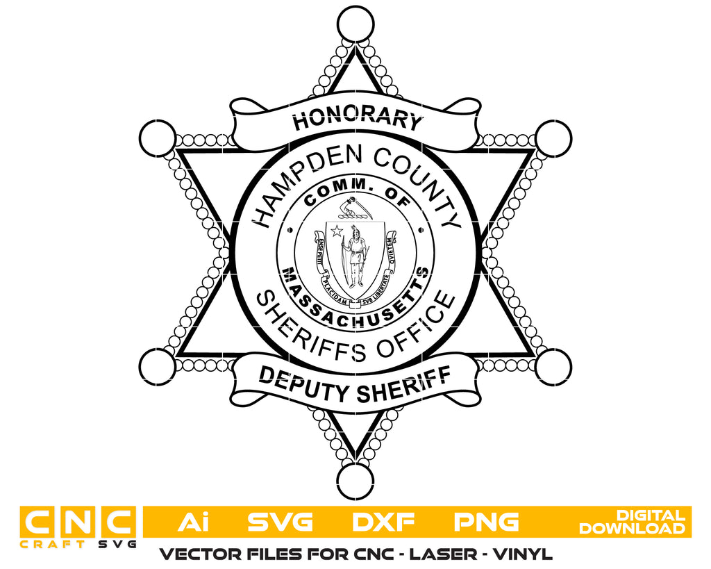 Honor the service, dedication, and professionalism of Massachusetts law enforcement with this Hampden County Deputy Sheriff’s Office Badge SVG — a crisp, high-quality vector design perfect for crafting, printing, engraving, and commemorative projects.