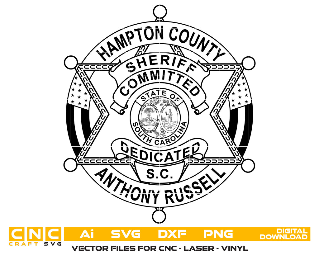 The Hampton County Sheriff’s Office Badge SVG is a professional South Carolina law enforcement emblem recreated in sharp vector format. Ideal for CNC cutting, laser engraving, vinyl decals, uniform decoration, commemorative plaques, and county signage, this badge ensures crisp, scalable results. With clean vector lines, it works seamlessly on wood, metal, fabric, and acrylic. A great choice for sheriff memorabilia, official recognition, and custom woodworking projects, this design delivers both authenticity and precision for engravers, crafters, and collectors.