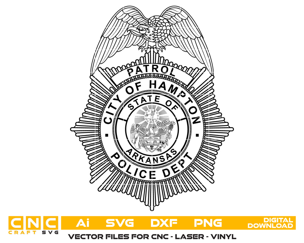 The Hampton Patrol Police Department Badge SVG is a finely detailed Arkansas law enforcement emblem recreated in high-quality vector format. Designed for versatility, this badge is perfect for CNC cutting, laser engraving, vinyl decals, uniform decoration, commemorative plaques, and department signage. With sharp vector lines, it delivers crisp, scalable results on wood, metal, fabric, and acrylic. A great choice for police memorabilia, officer recognition, and custom woodworking projects, this design ensures both authenticity and accuracy for engravers, crafters, and collectors.