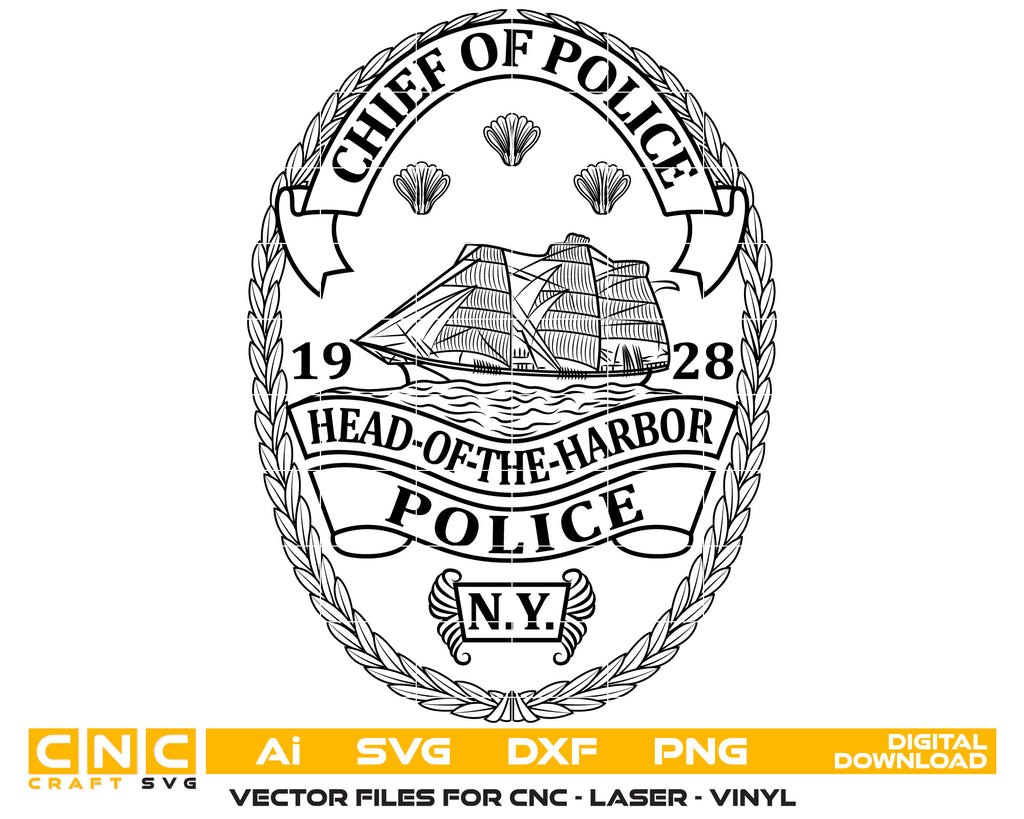 Download a high-quality Harbor Police Chief Badge SVG crafted with precision and attention to detail. This professional vector design features clean lines and perfect scalability, ideal for engraving, CNC cutting, laser etching, decals, apparel printing, signage, and commemorative artwork.