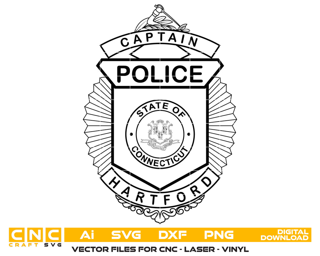 The Hartford Police Captain Badge SVG is a distinguished Connecticut law enforcement emblem recreated in sharp vector format. Designed for precision, this badge is ideal for CNC cutting, laser engraving, vinyl decals, uniform decoration, commemorative plaques, and department signage. With crisp vector lines, it ensures scalable results on wood, metal, fabric, and acrylic. Perfect for captain recognition, police memorabilia, and custom woodworking projects, this design offers both authenticity and professional detail for engravers, crafters, and collectors.