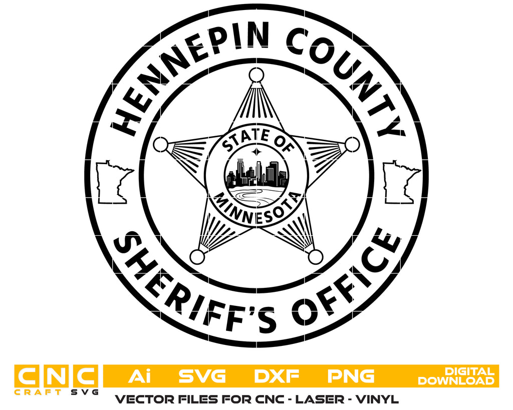Create professional-quality law enforcement designs with this Hennepin County Sheriff’s Office Badge SVG, a clean and detailed vector badge inspired by the Hennepin County Sheriff’s Office in Minnesota. Designed for accuracy and clarity, this badge artwork is ideal for high-quality cutting, engraving, and printing applications. Perfect for plaques, decals, uniforms, signage, and collectible sheriff badges.