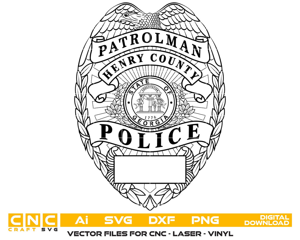 Crafted for accuracy and clarity, this Henry County Police patrolman badge vector maintains crisp edges and fine details at any size—ensuring flawless results for engraving, printing, and digital use.