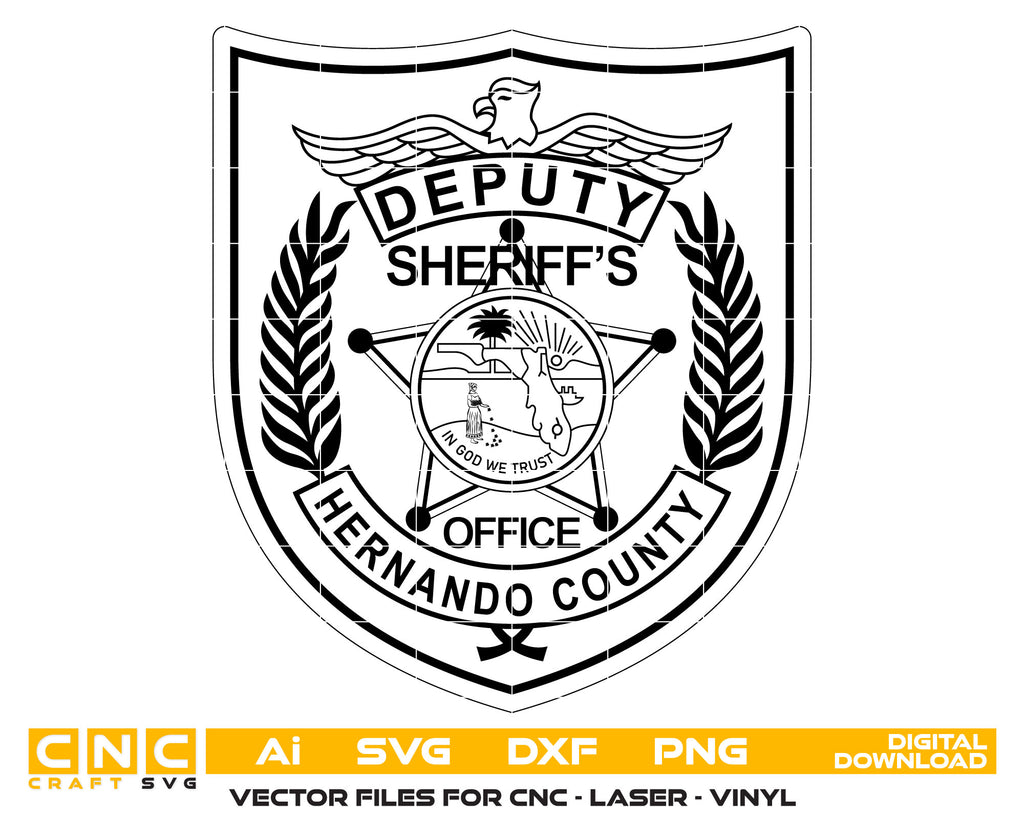 Get the distinctive look of the Hernando County Florida Sheriff's Office Patch with this detailed SVG design. Ideal for woodworking, engraving, and creative projects, this file ensures precise and professional results. Delivered in SVG, PNG, DXF, and AI formats.
