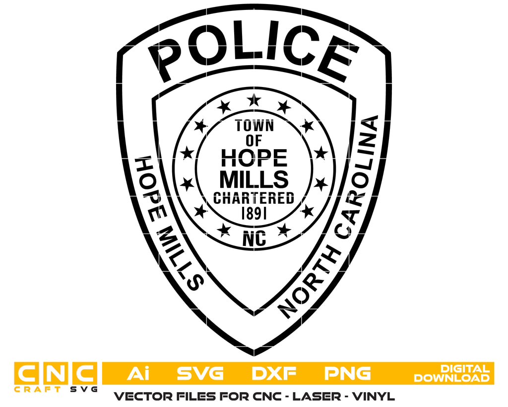 The Hope Mills North Carolina Police Patch SVG represents the dedication, service, and authority of North Carolina law enforcement officers. Designed in scalable vector format, it’s perfect for CNC cutting, laser engraving, vinyl decals, uniform embroidery, signage, and commemorative plaques. Ideal for collectors, police departments, and custom memorabilia projects, this patch maintains crisp detailing on metal, wood, fabric, and acrylic surfaces while honoring the Hope Mills Police Department.