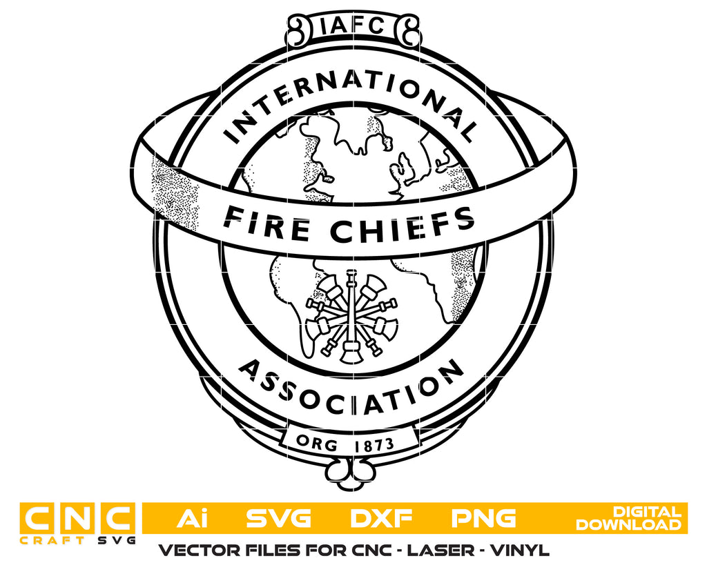 Download the International Fire Chiefs Association Logo in a professional, scalable vector format. Ideal for laser engraving, Cricut, Silhouette, Glowforge, and CNC machines. This detailed emblem is perfect for creating firefighter tribute plaques, decals, signs, apparel, and custom gifts that honor leadership in fire service.