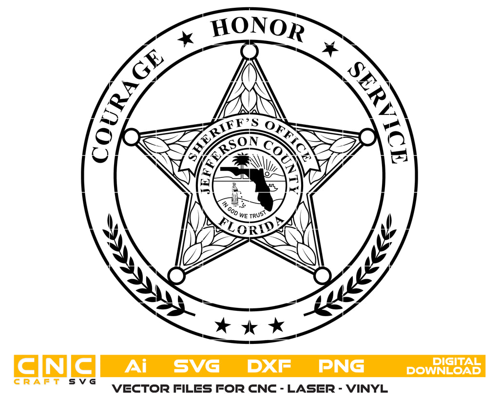 The Jefferson County Emergency Management Sheriff Badge SVG symbolizes leadership, readiness, and protection in county law enforcement and emergency response. Crafted in scalable vector format, this badge is perfect for CNC cutting, laser engraving, vinyl decals, uniforms, signage, and recognition plaques. Ideal for emergency management teams, sheriff departments, and collectible projects, it delivers crisp, professional detailing on metal, fabric, wood, or acrylic surfaces.
