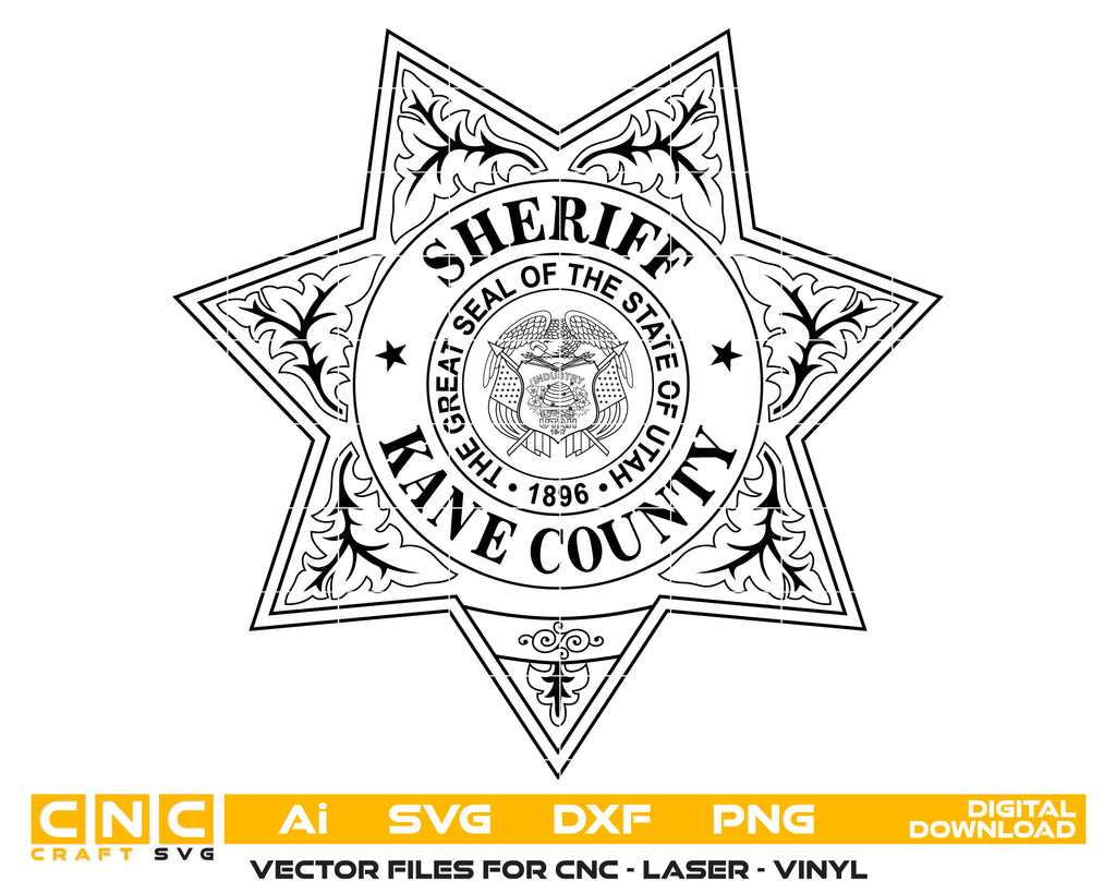 Create professional-quality law enforcement designs with this Kane County Sheriff Badge SVG, a clean and detailed vector badge inspired by the Kane County Sheriff’s Office in Utah. Designed for accuracy and clarity, this badge artwork is ideal for high-quality cutting, engraving, and printing applications.
