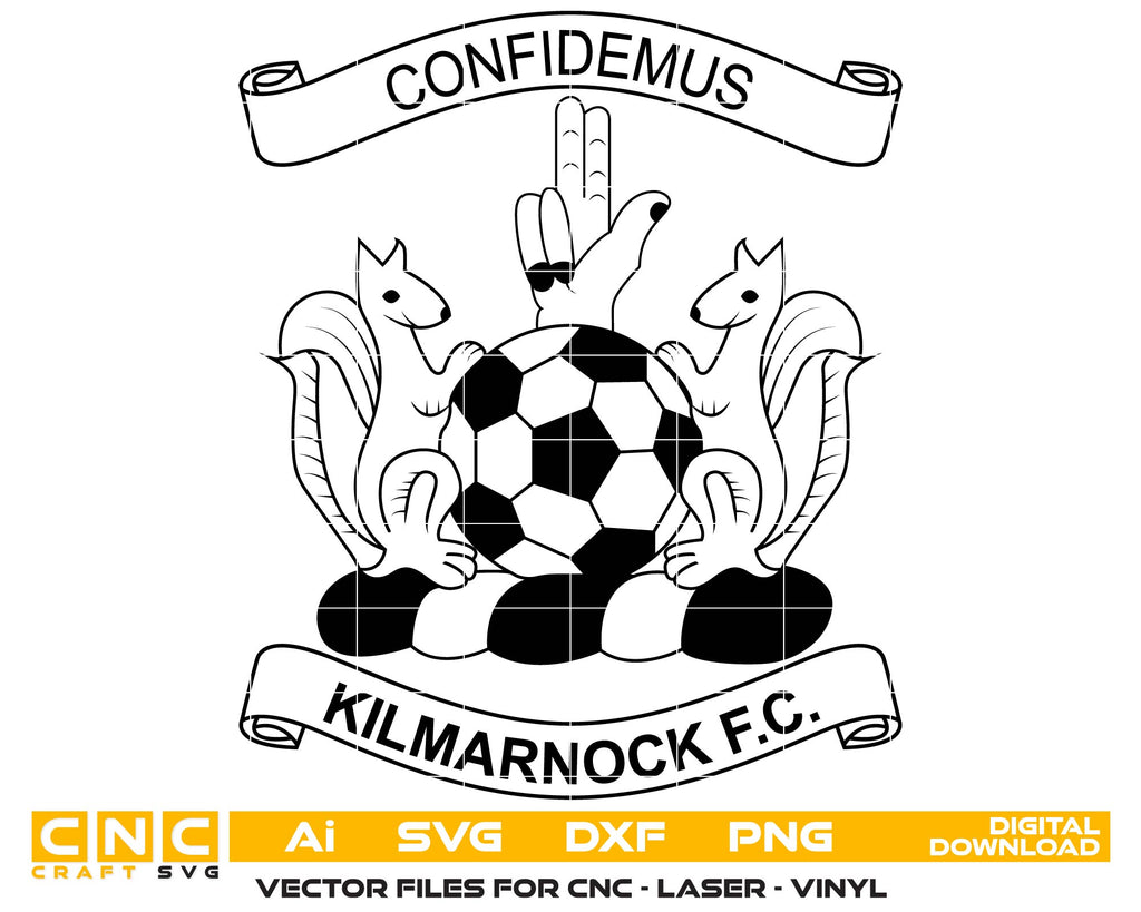 Celebrate Scottish football history with this Kilmarnock FC Logo SVG. This distinctive vector design captures the classic "Killie" crest, featuring the two iconic squirrels supporting a football, the blessing hand, and the club motto "Confidemus" ("We Trust"). Expertly traced for clean lines, this file is optimized for CNC routing, laser engraving, and vinyl cutting. It is the perfect choice for creating fan cave signs, custom merchandise, and wooden tributes for loyal supporters.