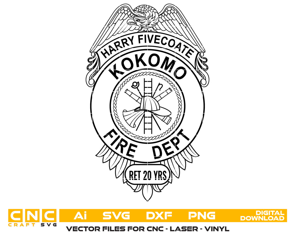 Download the detailed Kokomo Fire Department Badge in high-resolution vector format—perfect for laser engraving, vinyl decals, apparel printing, signage, firefighter tributes, and more. Designed for precision and scalability, this vector ensures clean and professional results on any material.