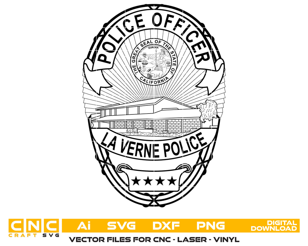 Download a professionally crafted La Verne Police Officer Badge SVG featuring sharp detailing, clean lines, and perfect scalability. This premium vector file is ideal for Cricut, Silhouette, CNC cutting, laser engraving, vinyl decals, signage, apparel, plaques, and both digital and print projects.