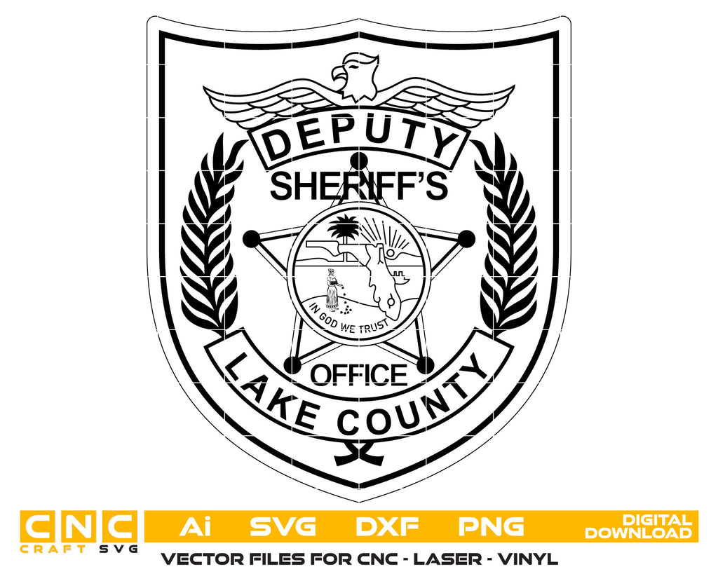 Represent the distinguished Lake County Florida Sheriff's Office with this high-quality SVG file. Ideal for woodworking, engraving, and creative projects, this vector design ensures crisp, precise results. Available in SVG, PNG, DXF, and AI formats for maximum versatility.