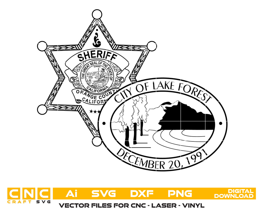 The Lake Forest Orange County Sheriff Badge SVG embodies the dedication and authority of California law enforcement. Professionally rendered in high-resolution vector format, it’s ideal for CNC engraving, vinyl decals, plaques, challenge coins, and uniform embroidery. Perfect for collectors, engravers, and design professionals, this badge showcases the honor and tradition of the Orange County Sheriff’s Department – Lake Forest Division with precise vector detailing for crisp reproduction.