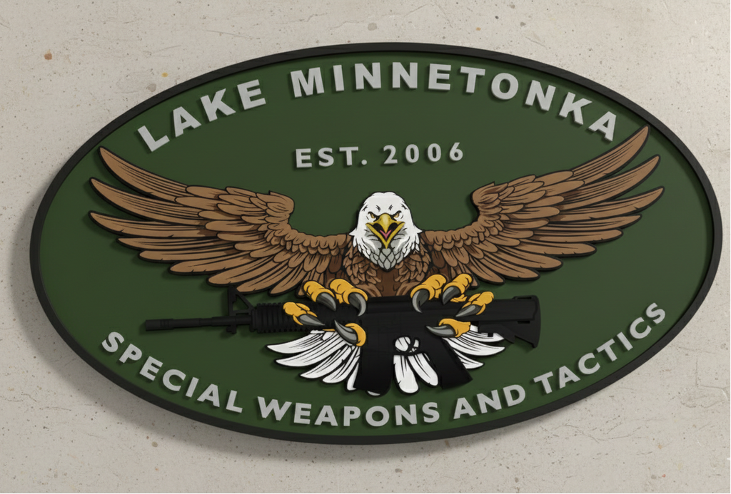 Bring a tactical edge to your projects with this Full-Color Lake Minnetonka SWAT Patch SVG. This vector design features the unit's authentic olive drab, black, and white color palette, showcasing the eagle and rifle emblem in sharp detail. While perfect for digital printing and sublimation, the layers are also clean enough for multi-color vinyl decals. Ideal for creating custom t-shirts, vehicle stickers, and coffee mug tributes for Minnesota's elite tactical team.