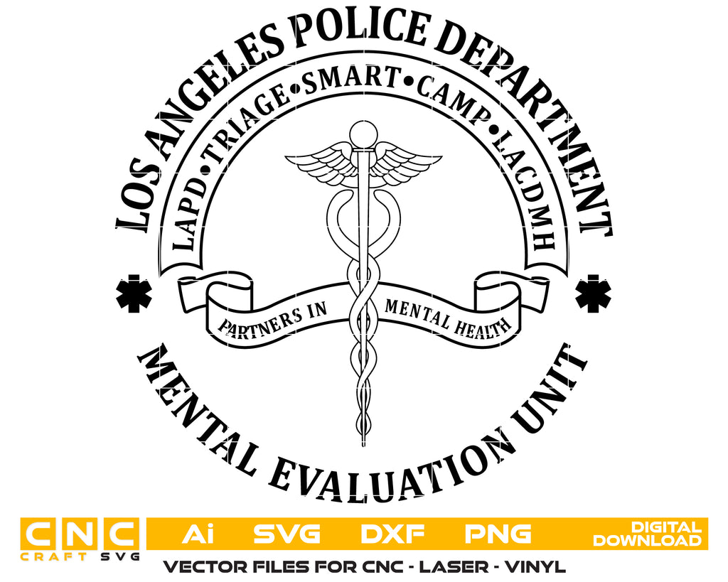 The LAPD Mental Evaluation Unit Logo SVG symbolizes the partnership between law enforcement and mental health services within the Los Angeles Police Department. Expertly designed in scalable vector format, this emblem represents professionalism, compassion, and duty. Ideal for training materials, departmental displays, decals, and educational projects, it delivers crisp detailing and authentic LAPD design elements for precision engraving or print applications.