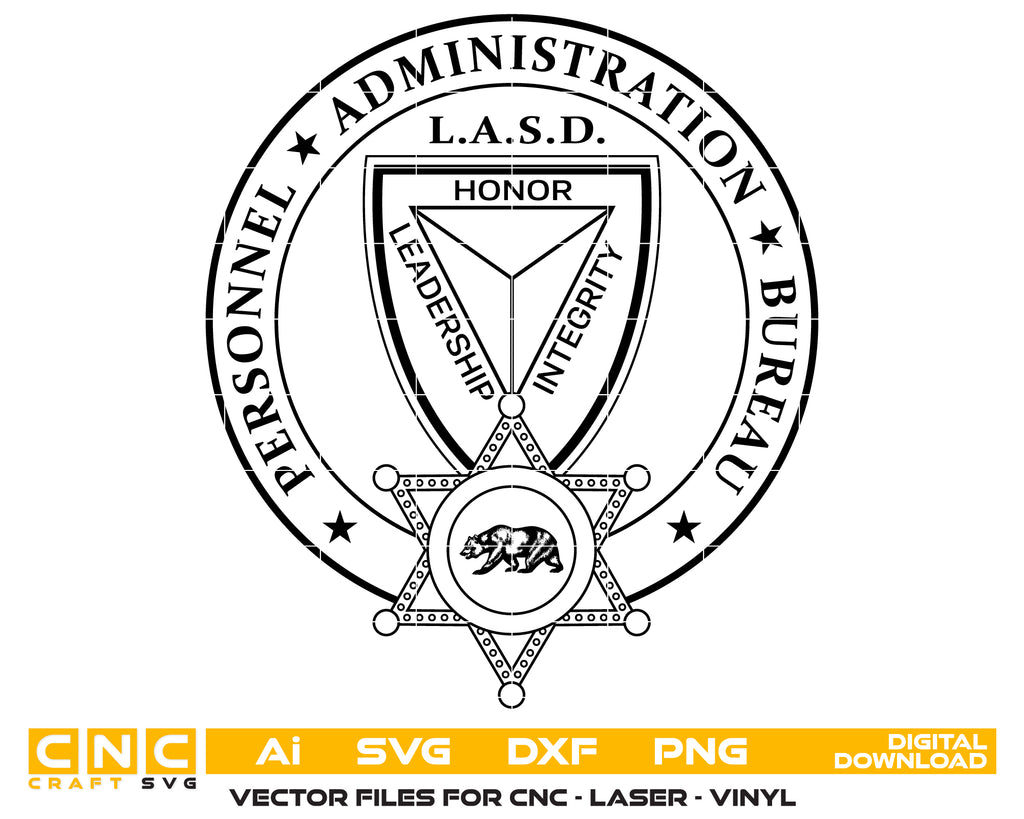 The LASD Personnel Administration Bureau Emblem SVG represents the Los Angeles County Sheriff’s Department division dedicated to managing personnel and administrative excellence. This high-quality vector design reflects professionalism, honor, and integrity, ideal for official presentations, law enforcement décor, training manuals, and recognition plaques. Scalable and precise, it maintains clear detail across digital and print applications.