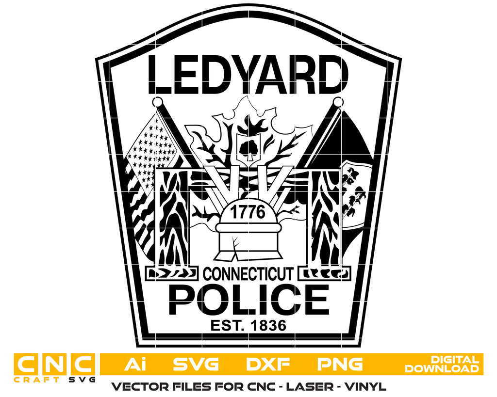 Honor the dedication, service, and professionalism of Connecticut law enforcement with this Ledyard Police Department Patch SVG — a crisp, high-quality vector design perfect for crafting, printing, engraving, and commemorative projects.