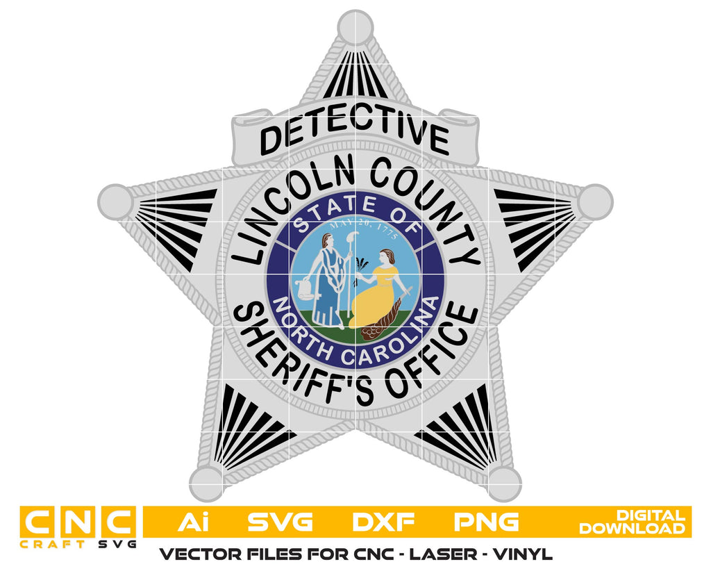 Complete your North Carolina law enforcement collection with this Lincoln County Sheriff's Office Detective Badge SVG. This specific variation features the "Sheriff's Office" bottom rocker and "Lincoln County" top arc, distinct from the Deputy version. Centered with the detailed Great Seal of North Carolina, this vector is precision-traced for professional CNC routing, laser engraving, and custom vinyl work. Perfect for department tributes, retirement gifts, and official office signage.