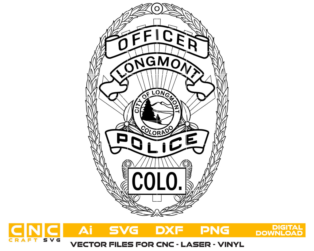 Create professional-quality law enforcement designs with this Longmont Police Officer Badge SVG, a clean and detailed vector badge inspired by the Longmont Police Department in Colorado. Designed for accuracy and clarity, this badge artwork is ideal for high-quality cutting, engraving, and printing applications. Perfect for plaques, decals, uniforms, signage, and collectible police badges.