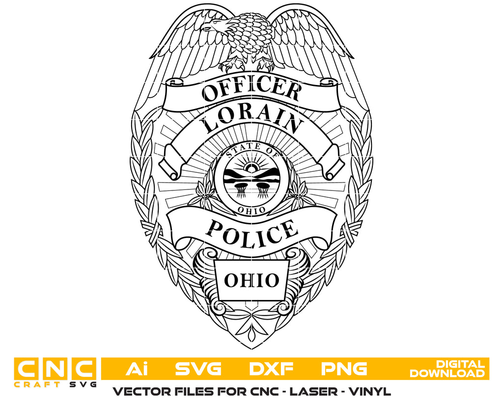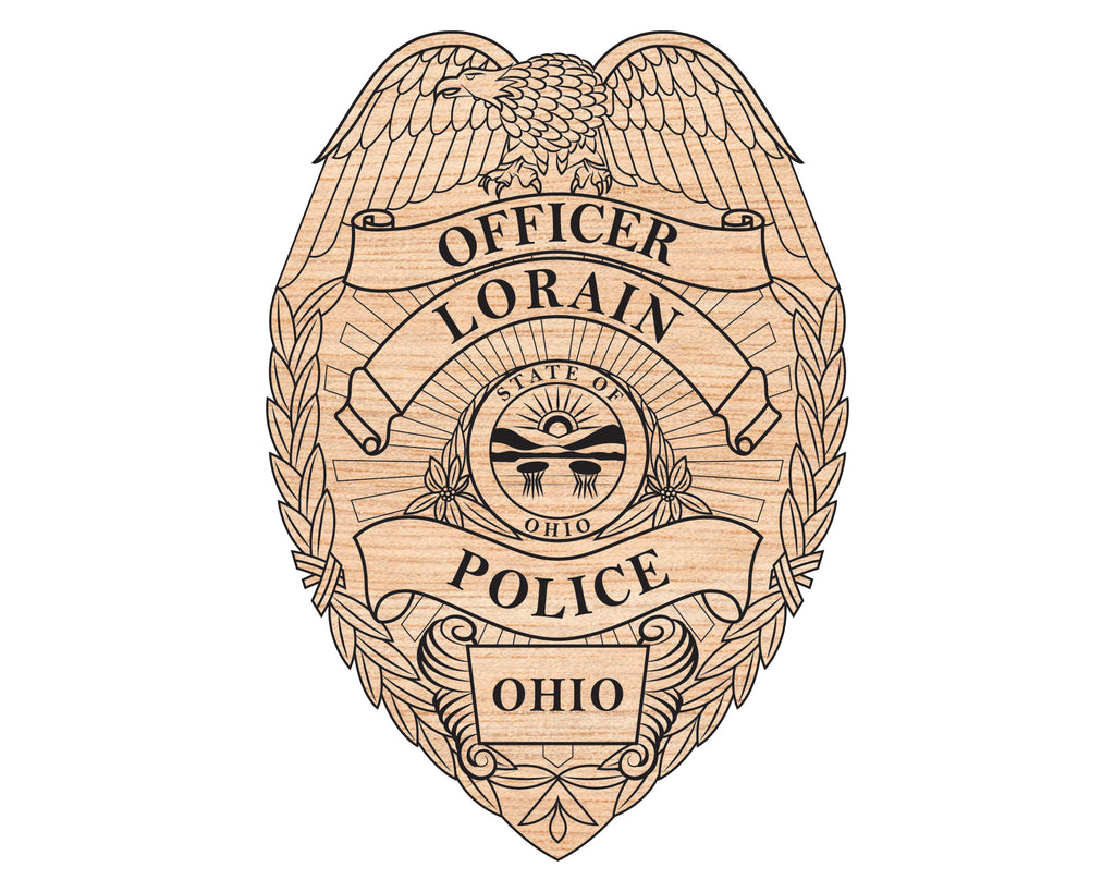 Create professional-quality law enforcement designs with this Lorain Police Officer Badge SVG, a clean and detailed vector badge inspired by the Lorain Police Department in Ohio. Designed for accuracy and clarity, this badge artwork is ideal for high-quality cutting, engraving, and printing applications. Perfect for plaques, decals, uniforms, signage, and collectible police officer badges.