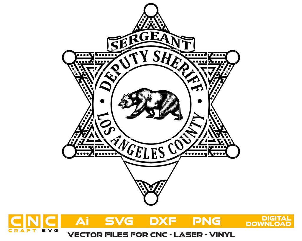 The Los Angeles Deputy Sheriff Sergeant Badge SVG symbolizes authority, leadership, and dedication within California law enforcement. Designed in scalable vector format, this badge is perfect for CNC cutting, laser engraving, vinyl decals, uniforms, plaques, and collectibles. Ideal for sheriff departments, collectors, and engraving projects, it maintains crisp detailing on metal, wood, fabric, and acrylic, proudly representing the Los Angeles County Sheriff’s Department.