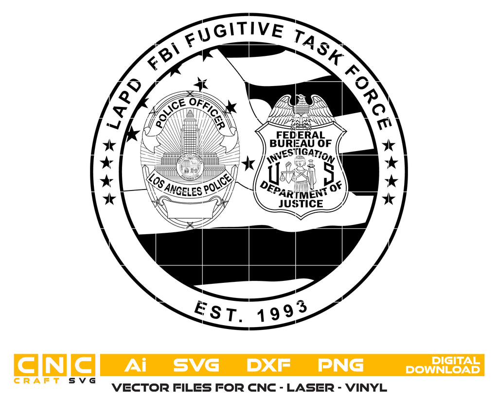 The Los Angeles Fugitive Task Force Badge SVG represents the dedication, vigilance, and authority of California law enforcement officers specializing in fugitive apprehension. Designed in scalable vector format, this badge is perfect for CNC cutting, laser engraving, vinyl decals, uniforms, plaques, and collectibles. Ideal for law enforcement personnel, collectors, and engraving projects, it delivers crisp detailing on metal, wood, fabric, and acrylic, honoring the Los Angeles Fugitive Task Force.