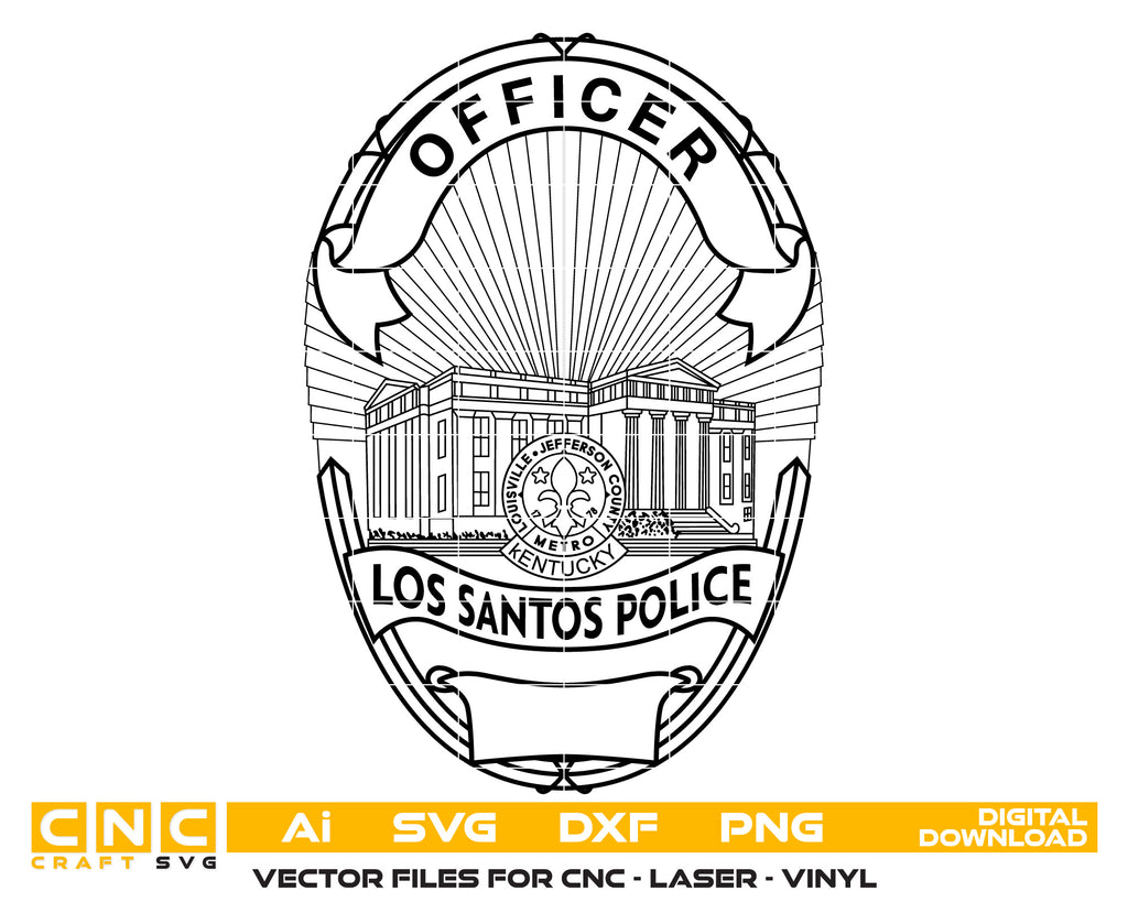Download the Los Santos Police Officer Badge in a crisp, high-resolution vector format. Ideal for laser engraving, Cricut, Silhouette, Glowforge, and CNC machines. Inspired by in-game law enforcement design, this badge is perfect for fan art, cosplay props, tribute signs, decals, apparel, and custom gifts for gamers and creators.