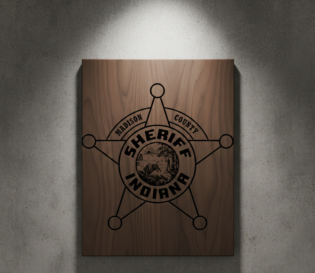 Represent the Hoosier State with this Madison County Sheriff Badge SVG. This classic five-point star design features the official Seal of Indiana at its center, showcasing the iconic scene of the pioneer woodcutter and the buffalo. Meticulously traced for precision, this file is optimized for CNC routing, laser engraving, and vinyl cutting. It is the perfect choice for creating retirement plaques, custom department tributes, and wooden flags for Indiana law enforcement.