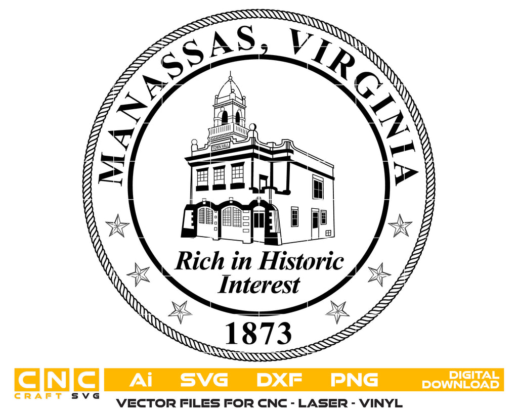 Discover this high-quality Vector SVG file, designed for CNC cutting, laser engraving, and woodworking. Featuring the official seal of Manassas, Virginia, this design is perfect for city signage, commemorative artwork, public décor, and custom engraving projects.